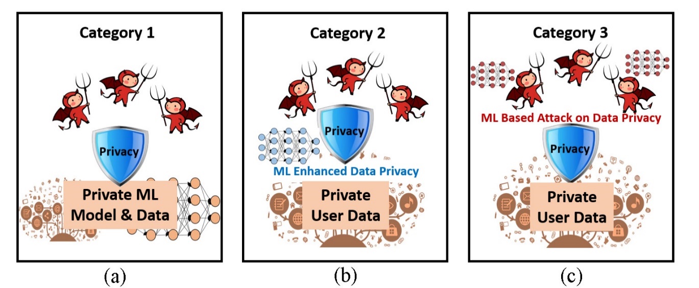 Privacy-aware machine learning includes two aspects: 1) privacy leakage, and 2) privacy protection. In privacy leakage, an attacker intends to derive sensitive information from machine learning models. The privacy leakage problems include membership inference, data property inference, sample reconstruction, and model extraction. In privacy protection, one studies the countermeasures of how to prevent machine learning models from leaking privacy, e.g., differential privacy, model compression, selective sharing and more. We are currently studying privacy and security issues in deep learning, including training data privacy and model privacy. Examples are various inference attacks in collaborative learning and inference-based similarity search for privacy-preserving biometric identification. Figure 4 demonstrates three different categories of research problems in privacy and machine learning (ML): (a) Model privacy and data privacy; (b) ML-enhanced privacy protection; (c) ML-based privacy attack.